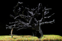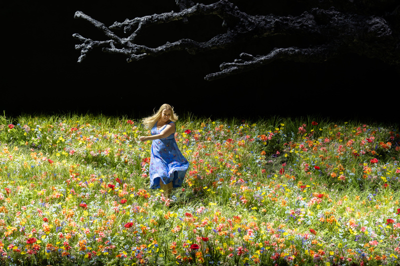 Dann die letzte Verwandlung: Brünnhildes Felsen ist kein karger Berg, sondern eine farbenprächtige, blühende Wiese. Ein großer Baum dominiert die Bühne, in dessen hohlem Stamm die allgegenwärtige Erda häufig erscheint.
